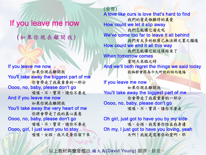 歌唱 (楊大為) 第 008 曲: If You Leave Me Now (如果你現在離開我)