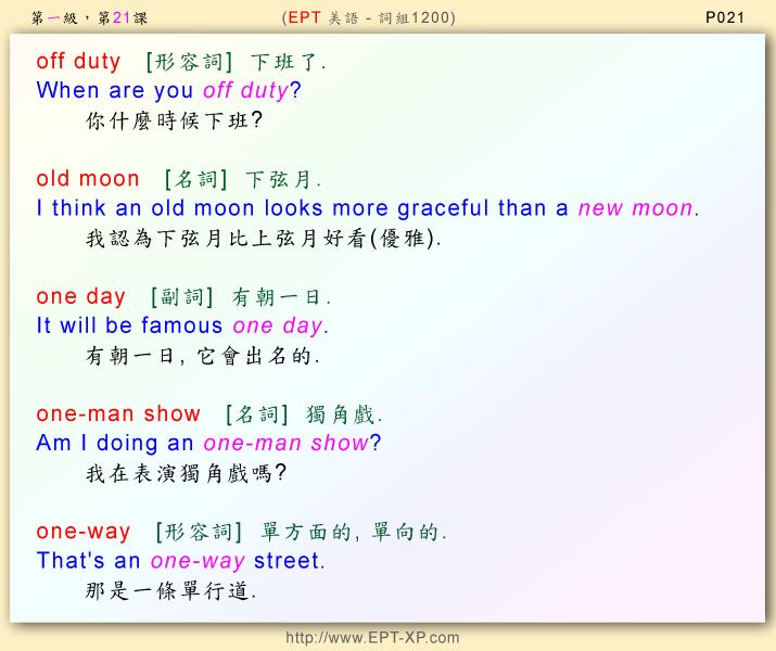 第二部 第一課: ---請大聲重複跟讀 3-5 回合, 不多久, 您必可說出流暢的美語--- off duty ; old moon ; one day ; one-man show ; one-way