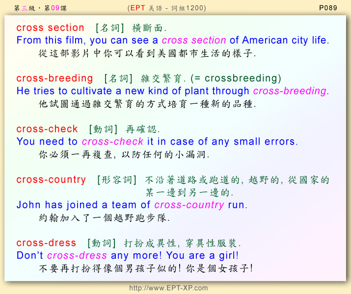 第五部 第九課: ---請大聲重複跟讀 3-5 回合, 不多久, 您必可說出流暢的美語--- cross section ; cross-breeding ; cross-check ; cross-country ; cross-dress