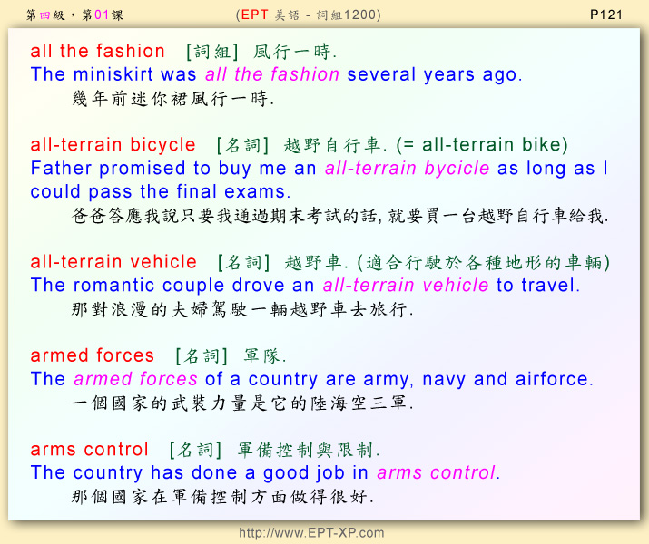 第七部 第一課: ---請大聲重複跟讀 3-5 回合, 不多久, 您必可說出流暢的美語--- all the fashion ; all-terrain bicycle ; all-terrain vehicle ; armed forces ; arms control