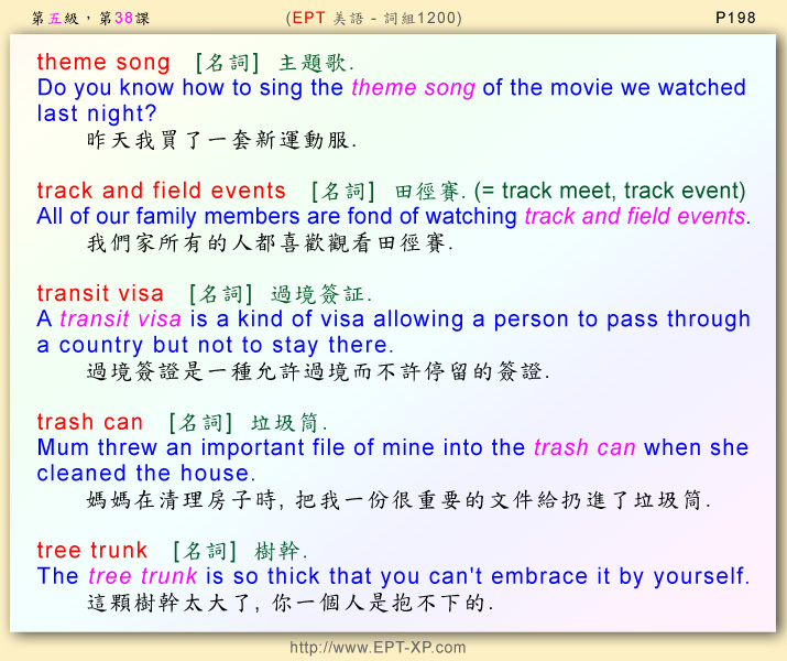 第十部 第18課: ---請大聲重複跟讀 3-5 回合, 不多久, 您必可說出流暢的美語--- theme song ; track and field events ; transit visa ; trash can ; tree trunk