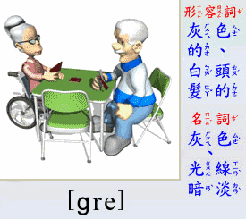- [形容詞] 灰色的, 偏灰的, 灰白頭髮的.