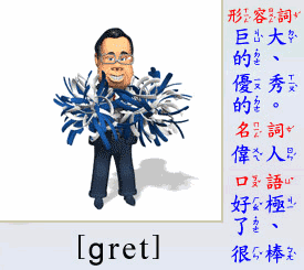 - [形容詞] (數量, 規模等)巨大的, 偉大的, 優秀的.