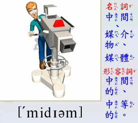 - [名 詞] 中間, 適中, 媒介物, 媒體, (生物的)生活環境.