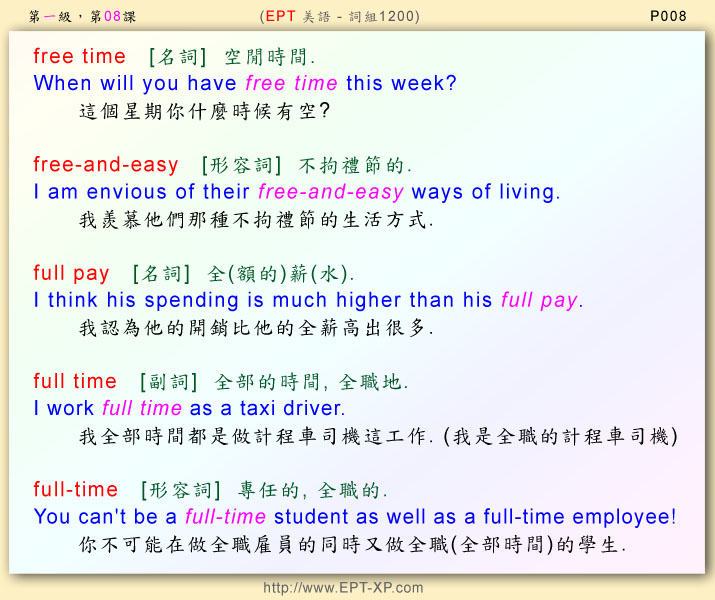 第一部 第八課: ---請大聲重複跟讀 3-5 回合, 不多久, 您必可說出流暢的美語--- free time ; free-and-easy ; full pay ; full time ; full-time