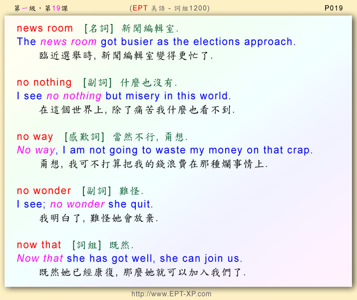 第一部 第19課: ---請大聲重複跟讀 3-5 回合, 不多久, 您必可說出流暢的美語--- news room ; no nothing ; no way ; no wonder ; now that