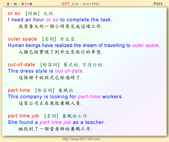 第二部 第三課: ---請大聲重複跟讀 3-5 回合, 不多久, 您必可說出流暢的美語--- or so ; outer space ; out-of-date ; part-time ; part time job