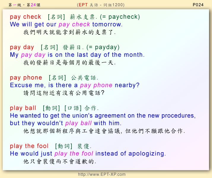 第二部 第四課: ---請大聲重複跟讀 3-5 回合, 不多久, 您必可說出流暢的美語--- pay check ; pay day ; pay phone ; play ball ; play the fool