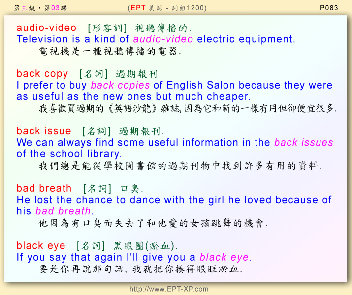 第五部 第三課: ---請大聲重複跟讀 3-5 回合, 不多久, 您必可說出流暢的美語--- audio-video ; back copy ; back issue ; bad breath ; black eye