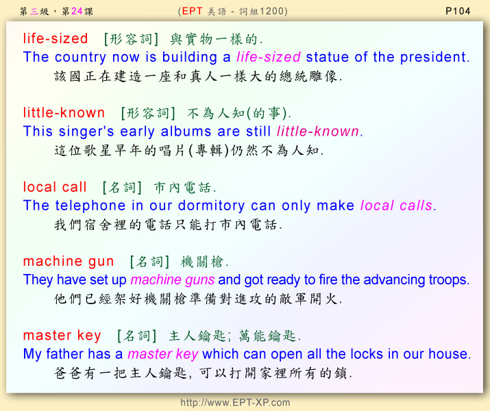 第六部 第四課: ---請大聲重複跟讀 3-5 回合, 不多久, 您必可說出流暢的美語--- life-sized ; little-known ; local call ; machine gun ; master key