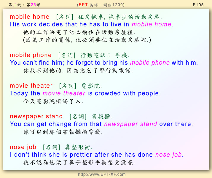 第六部 第五課: ---請大聲重複跟讀 3-5 回合, 不多久, 您必可說出流暢的美語--- mobile home ; mobile phone ; movie theater ; newspaper stand ; nose job