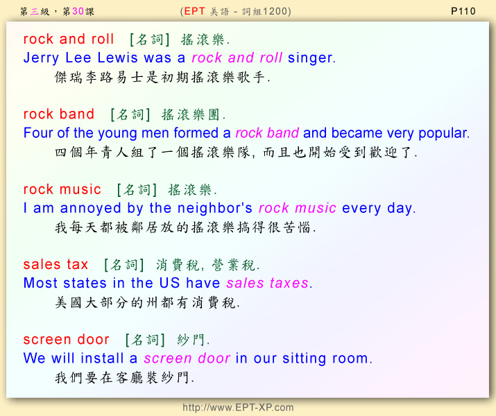 第六部 第十課: ---請大聲重複跟讀 3-5 回合, 不多久, 您必可說出流暢的美語--- rock and roll ; rock band ; rock music ; sales tax ; screen door