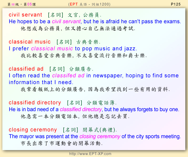 第七部 第五課: ---請大聲重複跟讀 3-5 回合, 不多久, 您必可說出流暢的美語--- civil servant ; classical music ; classified ad ; classified directory ; closing ceremony