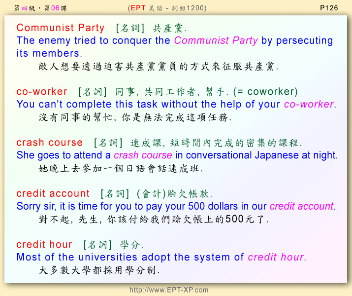 第七部 第六課: ---請大聲重複跟讀 3-5 回合, 不多久, 您必可說出流暢的美語--- Communist Party ; co-worker ; crash course ; credit account ; credit hour