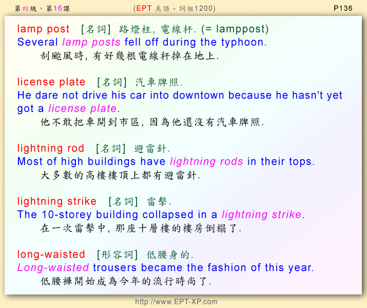 第七部 第16課: ---請大聲重複跟讀 3-5 回合, 不多久, 您必可說出流暢的美語--- lamp post ; license plate ; lightning rod ; lightning strike ; long-waisted
