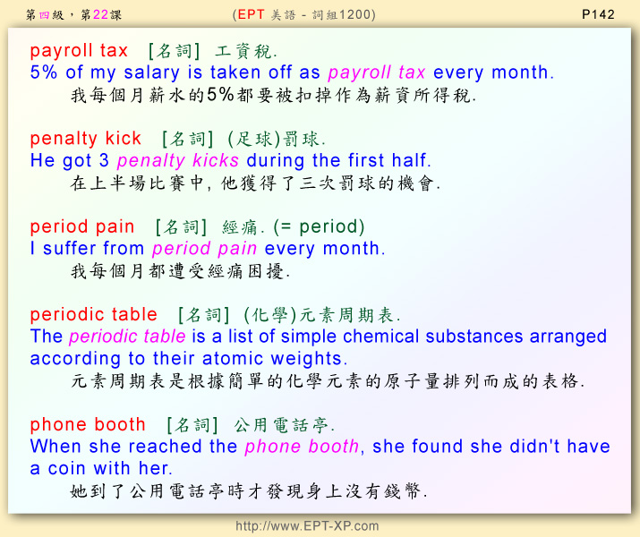 第八部 第二課: ---請大聲重複跟讀 3-5 回合, 不多久, 您必可說出流暢的美語--- payroll tax ; penalty kick ; period pain ; periodic table ; phone booth