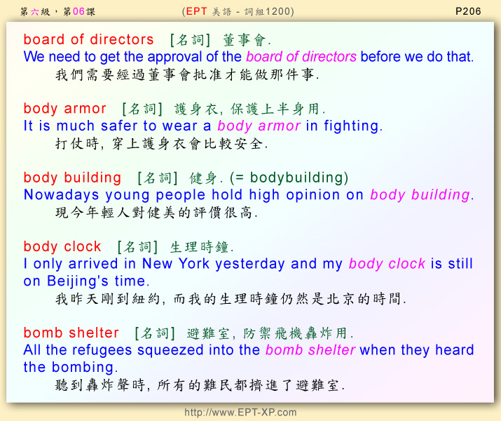 第11部 第六課: ---請大聲重複跟讀 3-5 回合, 不多久, 您必可說出流暢的美語--- board of directors ; body armor ; body building ; body clock ; bomb shelter