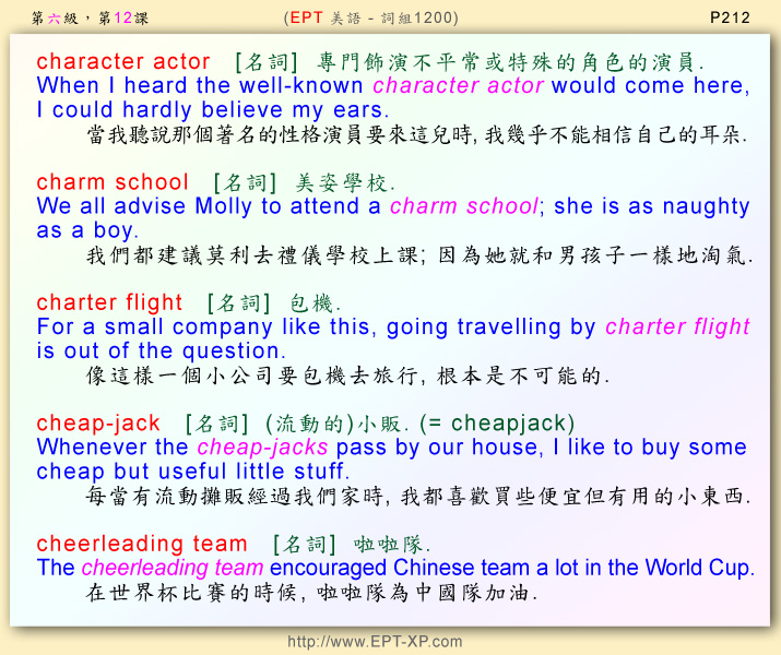 第11部 第12課: ---請大聲重複跟讀 3-5 回合, 不多久, 您必可說出流暢的美語--- character actor ; charm school ; charter flight ; cheap-jack ; cheerleading team