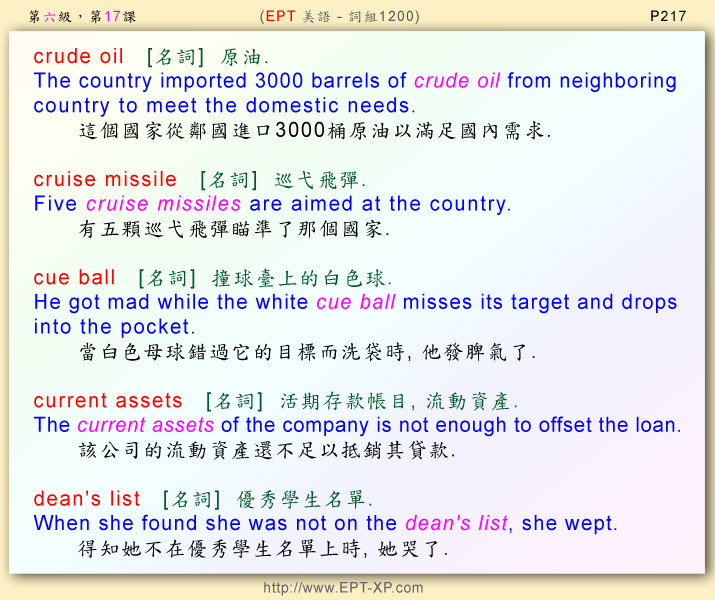 第11部 第17課: ---請大聲重複跟讀 3-5 回合, 不多久, 您必可說出流暢的美語--- crude oil ; cruise missile ; cue ball ; current assets ; dean's list