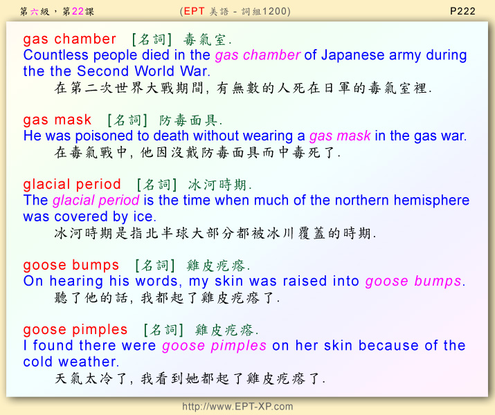第12部 第二課: ---請大聲重複跟讀 3-5 回合, 不多久, 您必可說出流暢的美語--- gas chamber ; gas mask ; glacial period ; goose bumps ; goose pimples