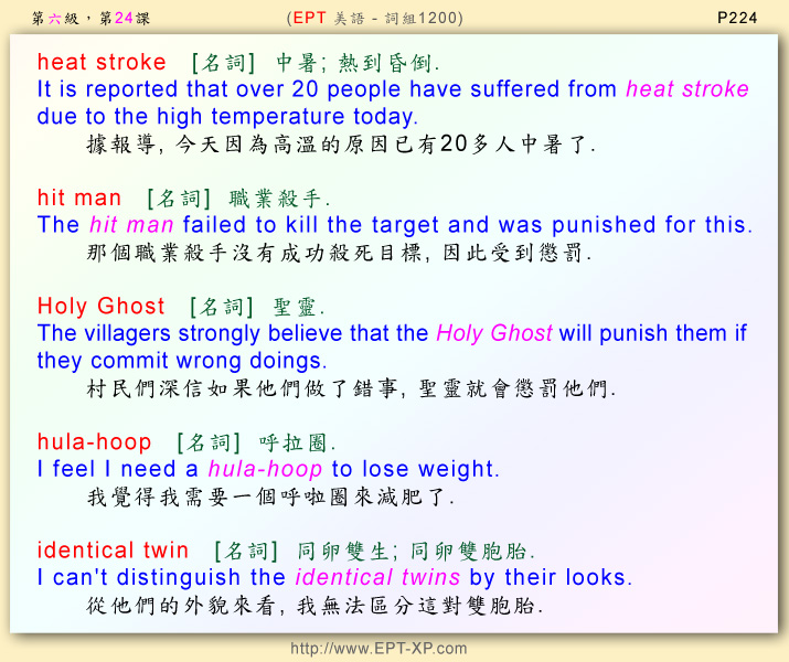 第12部 第四課: ---請大聲重複跟讀 3-5 回合, 不多久, 您必可說出流暢的美語--- heat stroke ; hit man ; Holy Ghost ; hula-hoop ; identical twin