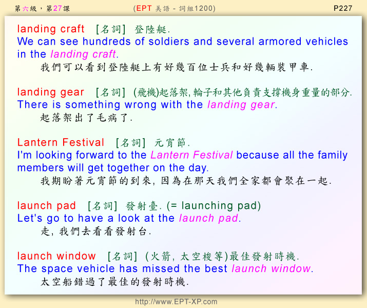 第12部 第七課: ---請大聲重複跟讀 3-5 回合, 不多久, 您必可說出流暢的美語--- landing craft ; landing gear ; Lantern Festival ; launch pad ; launch window