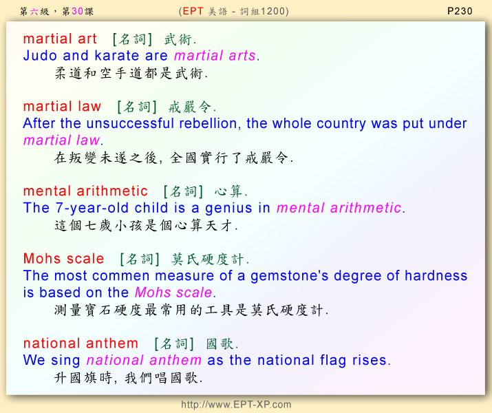 第12部 第十課: ---請大聲重複跟讀 3-5 回合, 不多久, 您必可說出流暢的美語--- martial art ; martial law ; mental arithmetic ; Mohs scale ; national anthem