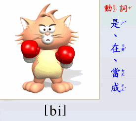 - [動 詞]  是, 正在 …, 在 …, 當成 ...