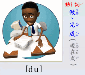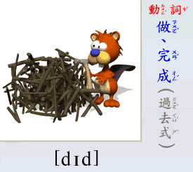 - [動 詞] 做, 製作, 完成. (這是不規則變化的動詞; 其過去式是 did, 過去分詞是 done)