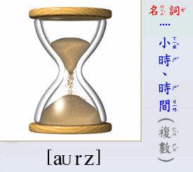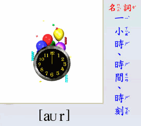 - [名 詞] 一小時, 時刻, 時間. (hour 的複數)