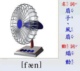 - [名 詞] 扇子, 風扇, 狂熱愛好者.