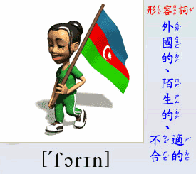 - [形容詞] 外國的, 陌生的, 不適合的.