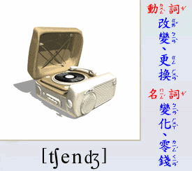 - [動 詞]  變化, (使)改變, 更改, 兌換(錢).