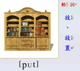 - [動 詞] 放, 放置. (put 的過去式與過去分詞亦是 put)