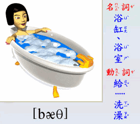 - [名 詞] 沐浴用的水, 浴缸, 浴室.