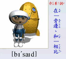 - [介係詞] 在 … 旁, 在旁邊, 和 … 相比.