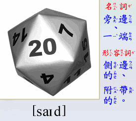 - [形容詞] 側邊的, 邊上的; 附帶的, 額外的.