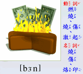 - [動 詞] 燃燒, 燒死, 燙傷, 激起 … 的憤怒.