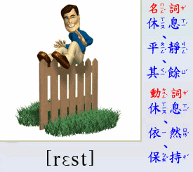 - [名 詞]  休息, 停止, 平靜;  剩餘的部份, 其餘的人.