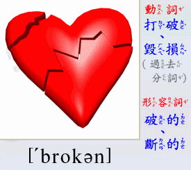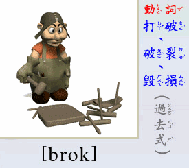 - [動 詞] 打破, 破裂, 毀損. (break 的過去分詞)