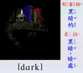 - [名 詞] 黑暗, 暗處, 傍晚.