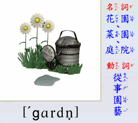 - [動 詞] 從事園藝. [形容詞] 花園的, 庭院的.