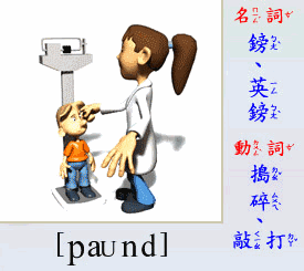 - [名 詞]  磅(重量單位), 英鎊(錢的單位).