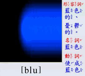 - [名 詞] 藍色, 天藍色, 藍色顏料, 藍色染料.