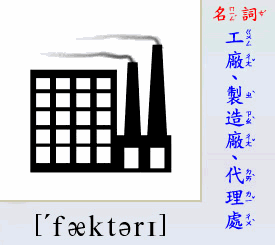 - [名 詞] 工廠, 製造廠, (商行在國外的)代理處.