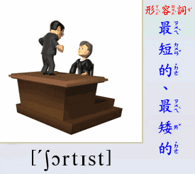 - [形容詞] 最短的, 最矮的. (short 的最高級)