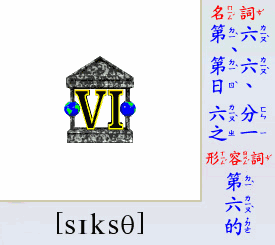 - [名 詞] 第六, (一個月的)第六日, 六分之一.