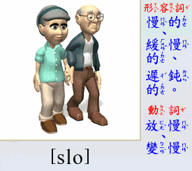 - [形容詞] 慢的, 緩慢的, 遲鈍.