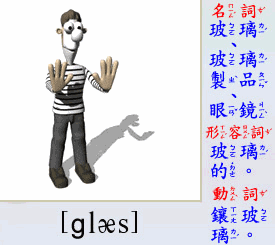 - [名 詞] 玻璃, 玻璃製品, 玻璃杯, 鏡子, 眼鏡.