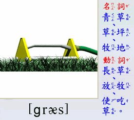 - [名 詞] (青)草, 牧草, 草坪, 牧地.